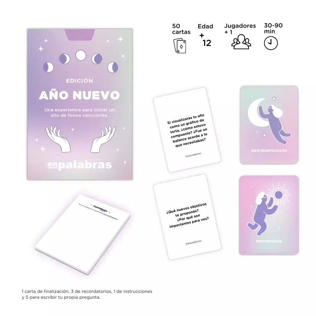 Esta edición especial te propone hacer un balance del año que se va y proyectar el nuevo desde un enfoque realista y emocionalmente honesto. El juego es práctico, cómodo de transportar y podés jugarlo a solas o acompañado/a.